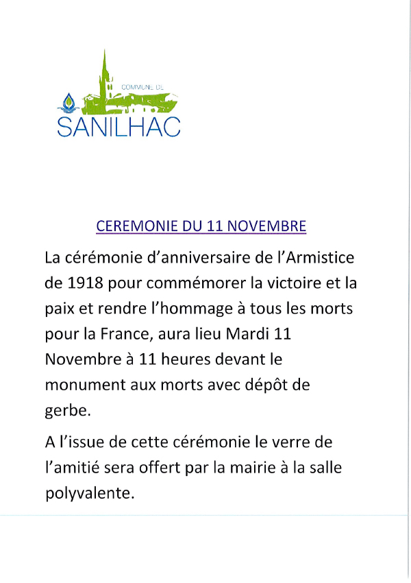 Mardi 11 novembre à 11h devant le monument aux morts avec dépôt de gerbe.